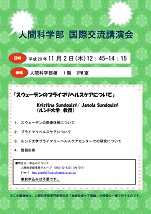 人間科学部では,国際交流活動の推進を目的として,11月2日(木),スウェーデンのルンド大学から講師を招聘し,「スウェーデンのプライマリヘルスケアについて」と題した講演会を開催いたしますので,興味・関心のある方は是非ご参加ください。事前の申込は不要です。