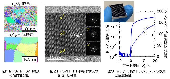 島根大学 総合理工学部の曲助教・葉准教授は、高知工科大学 古田教授と共同で、次世代半導体材料の低温合成手法を見出し(図1, 2)、代表的な酸化物半導体である非晶質InGaZnO(IGZO)(用語1)の10倍以上かつ、現在実用化されている多結晶シリコン(LTPS)(用語2)を凌駕する、世界最高性能の酸化物薄膜トランジスタ(用語3)を実証しました(図3)。合成した水素化多結晶酸化インジウムは透明かつ低温合成可能であり、次世代ディスプレイや半導体メモリーの高性能・低電力化に加え、透明フレキシブルデバイス(用語4)などへの発展が期待されます。