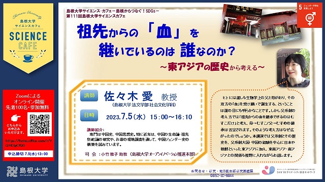 第111回島根大学サイエンスカフェは、島根大学 法文学部社会文化学科 佐々木 愛 教授が、「祖先からの「血」を継いでいるのは誰なのか? ~東アジアの歴史から考える~をテーマにお話します。