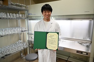 2023年9月11日から13日に千葉大学西千葉キャンパスで開催された、第40回日本植物バイオテクノロジー学会(千葉)大会において、自然科学研究科農生命科学専攻農林生産学コース2年生の水落俊良さんが「学生優秀発表賞」を受賞しました。水落さんは、ブドウ‘シャインマスカット’の組織培養技術における不定胚形成ついて効果的な培養条件を見出し、植物個体再生の効率をより高める方法を報告しました。学生による口頭発表56題のエントリーのうち、研究内容、プレゼンテーション、質疑応答の3項目について特に優れていると認められた発表6題の中の一つに選ばれました。