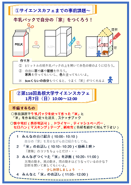 (牛乳パックで「家」をつくる。詳細はサイエンスカフェチラシ裏面をご覧ください) - 対面での参加が可能な方。
