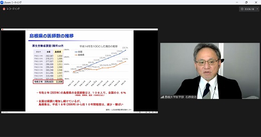 医学部長講話の時間では、本学の医学科教育の特徴や島根県の医師数などについて紹介し、模擬授業では、各講師が事前課題として参加者が学習していた内容をもとに、医学部での学びや実際の医療現場での治療の進め方などについて、動画を交えながら紹介しました。