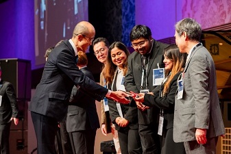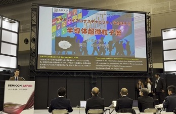 世界最大級の半導体国際展示会「SEMICON Japan 2023」(2023年12月13日~15日、@東京ビッグサイト)の主要イベントの一つであるアカデミアAward2023において、本学自然科学研究科物理・応用物理学コースの藤田恭久教授、吉田俊幸講師の研究室が「優秀賞」を受賞しました。この賞は、半導体が支える産業の長期的視点に立ち、将来の成果が期待できる研究を支援することを目的に2022年度に創設され、半導体関連の優れた研究を表彰する賞です。同展示会アカデミア・エリアに出展した研究室の中で、「革新性・発明力」「市場性」「技術パートナー・ネットワーク構築力」「表現力・プレゼンテーション」「次世代育成・チーム力」の各項目で審査されます。1次審査の書類選考において8研究室に絞られ、当研究室は地方大学として唯一2次審査へ進み、同展示会ステージにて、吉田俊幸講師、大学院生のKoustav Dasさん、Monty Shrestha Deyさん、Shaaista Hasanさんが、「電子デバイスのサステナビリティを加速する半導体超微粒子層」の題目で発表しました。審査の結果、単結晶や真空技術不要で既存の半導体技術を覆す革新性や市場性等が評価され、Semicon JapanアカデミアAward2023優秀賞を受賞しました。表彰式は記念晩餐会「SEMICON Japan GALA」(2023年12月13日、@ホテルオークラ)において行われました。