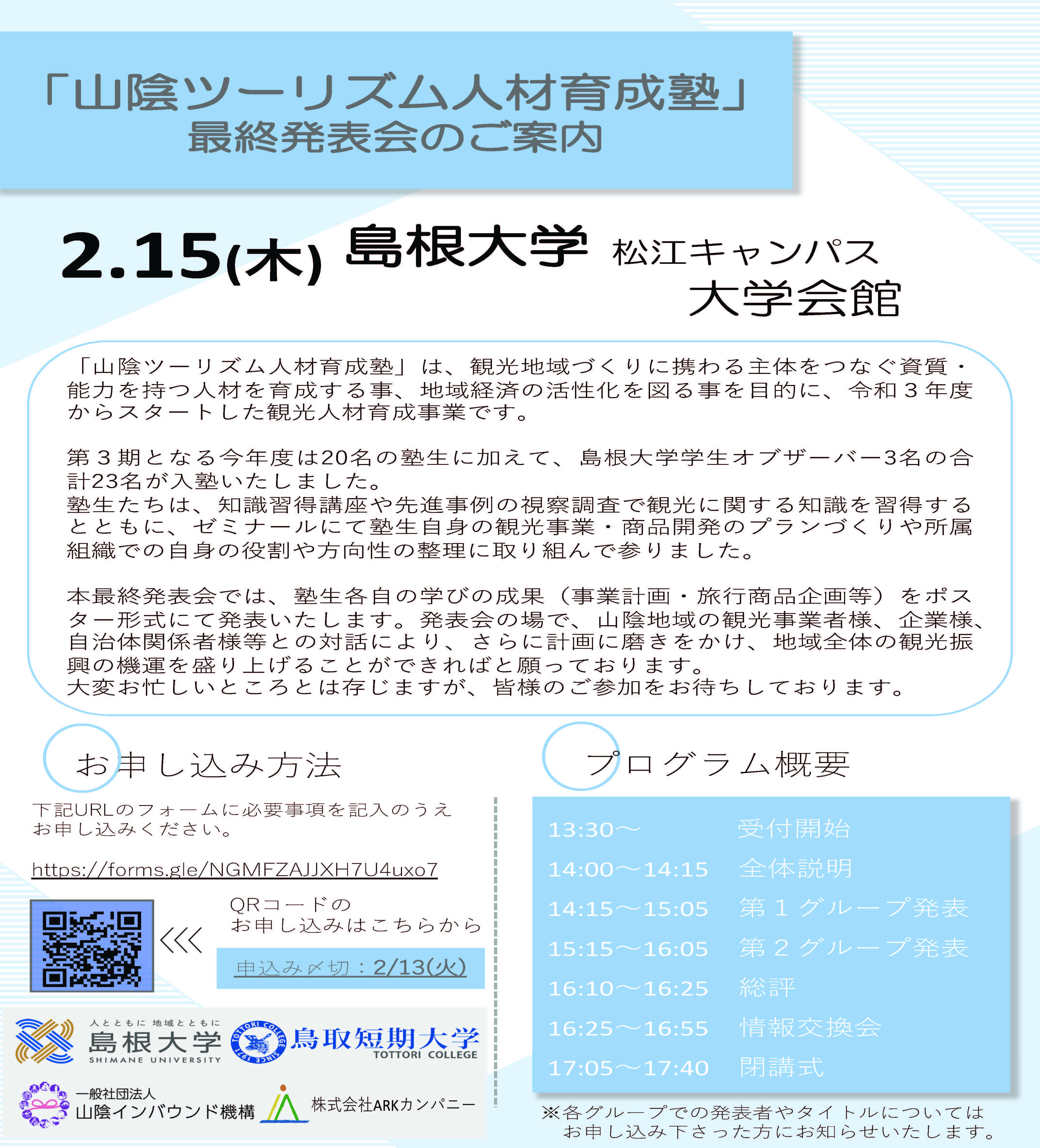 >>第3期 山陰ツーリズム人材育成塾 ~塾生による最終発表会のご案内~