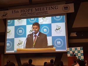 Raj Deepさんは酸化亜鉛ナノ粒子を用いた次世代の塗布型発光ダイオード(LED)に関する研究成果や受賞経歴などから将来性が評価され、日本からの参加者23名の中の一人として選抜されました。Raj Deepさんはニュートリノ振動を発見した梶田 隆章先生(2015年ノーベル物理学賞)や高温超電導体の発見者であるJ. ゲオルク・ベドノルツ先生(1987年ノーベル物理学賞)とのグループ活動や口頭発表、ポスター発表を通して活発な交流を行いました。