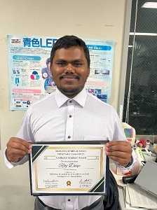 自然科学研究科(博士後期)創成理工学専攻のRaj Deepさん(藤田・吉田研究室)が2023年12月11~16日に京都国際会議場で開催されたMRM2023/IUMRS-ICA2023において”Influence of annealing atmosphere on ZnO nanoparticles based LEDs”という題目で研究発表を行いMRM Poster Awardを受賞しました。本会議は40か国から約2000名が参加した材料研究の大きな国際会議です。「Poster Award」は、優秀なポスター講演を行った学生に対して贈られる賞であり、18名の学生が受賞しました。