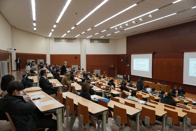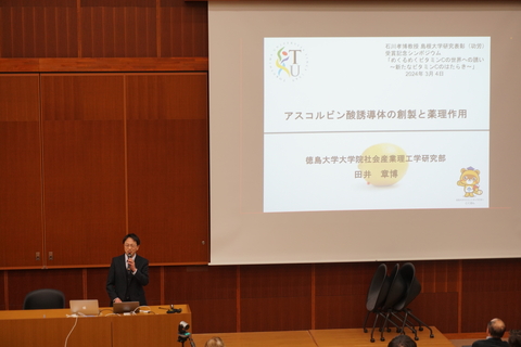 令和4年度に本学研究表彰(功労)を受賞した生物資源科学部の石川 孝博 教授の研究業績を広く学内外にアピールすることを目的に、3月4日(月)、「石川孝博教授 島根大学研究表彰(功労)受賞記念シンポジウム めくるめくビタミンCの世界への誘い~新たなビタミンCのはたらき~」を本学主催、日本ビタミン学会、ビタミンC研究委員会の後援により開催しました。会場の大学ホールには本学教職員・学生、一般の方を含む100名が集まり、43名のオンライン参加がありました。