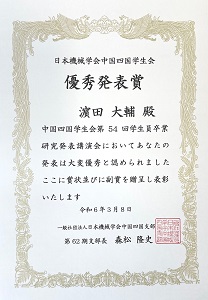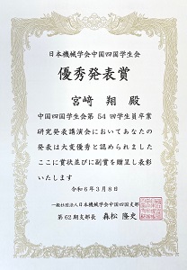 2024年3月7日に開催された日本機械学会中国四国学生会第54回学生員卒業研究発表講演会において,総合理工学部機械・電気電子工学科4年の宮﨑翔さん(指導教員:濱口雅史准教授)は「3自由度パラレルリンク型アクティブ吸振器付き全方向移動ロボットによる液体タンクの制振制御(ゲインスケジューリング手法を用いた制振制御)」の題目で,濵田大輔さん(指導教員:濱口雅史准教授)は「6自由度パラレルリンク型アクティブ吸振器付き搬送台車による液体タンクの制振制御(液位センサを用いない制振制御)」の題目で口頭発表を行い,「優秀発表賞」を受賞しました。