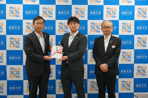 寄贈品の贈呈は,企業警備保障株式会社,株式会社山陰合同銀行によるもので,企業警備保障株式会社代表取締役社長 後長 佑様,株式会社山陰合同銀行常務執行役員 田中 良和様から大谷 浩学長へ目録が手渡されました。また,大谷学長からは,企業警備保障株式会社,株式会社山陰合同銀行それぞれに感謝状が贈られました。