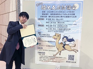 2024年11月16日および17日に開催された第57回酸化反応討論会(主催:第57回酸化反応討論会実行委員会)において、自然科学研究科 環境システム科学専攻 物質化学コースの福田竜己さん(前期課程2年生)がポスター発表を行い、「優秀賞」を受賞しました(指導教員:飯田拡基教授)。福田さんらは、有機分子触媒であるフラビンを用いることで、ピリジルメタンの酸素酸化による化学選択的な酸素添加反応を初めて報告しました。さらに、この反応を応用することで、蛍光材料として期待されている有用な含窒素多環式化合物の効率的な合成にも成功しています。本手法は、理想的な酸化剤である分子状酸素のみを消費することで反応が進行する低環境負荷型の反応です。本研究の一部は、国際目標であるSDGs(持続可能な開発目標)の実現を目指す取り組みとして、本学のSDGs研究プロジェクトからの支援を受けて実施されました。
