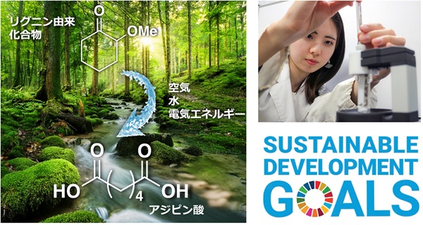 自然科学研究科物質化学コースの飯田拡基教授、新大軌教授らの研究グループは、同コースの村尾舞妃大学院生(研究当時)、水嶋大雅大学院生(研究当時)、および三宅葉月大学院生とともに、持続可能でカーボンニュートラルな木質バイオマス「リグニン」から、環境負荷の少ない方法でアジピン酸を合成する新技術を開発しました。アジピン酸は機能性プラスチックの原料として、世界で年間約300万トンが石油から製造されています。本研究では、石油に依存しないプラスチック生産への展開が期待されます。