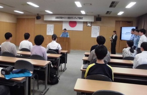 島根県警察サイバー防犯ボランティアとは,インターネット上の違法・有害情報を発見・通報するサイバーパトロールを行ったり,サイバー犯罪撲滅のための広報活動への参加等を行うもので,今年度は島根大学6名を含む、県内高校生・大学生計27名が委嘱を受けました。
