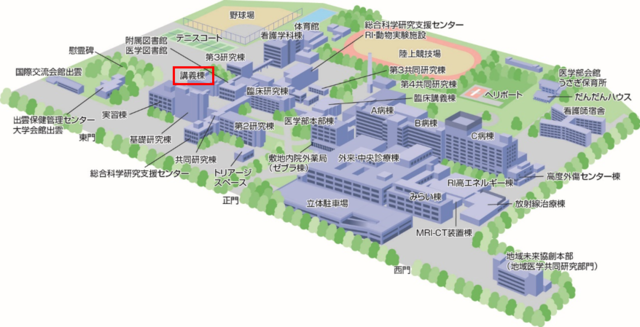 | 会場 | 医学部講義棟3階 L3講義室(島根県出雲市塩冶町89−1) 【出雲キャンパスマップ】※画像をクリックすると,拡大したマップが表示されます。 ![]() |