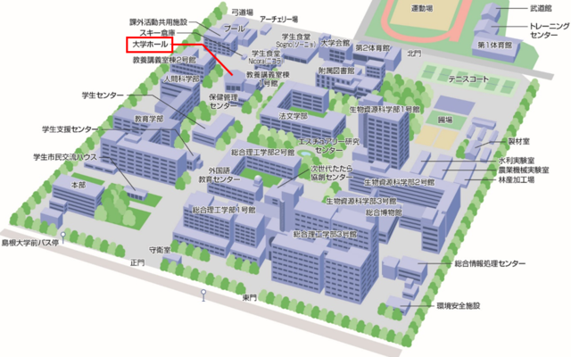 | 会場 | 大学ホール(島根県松江市西川津町1060) 【松江キャンパスマップ】※画像をクリックすると,拡大したマップが表示されます。 ![]() |