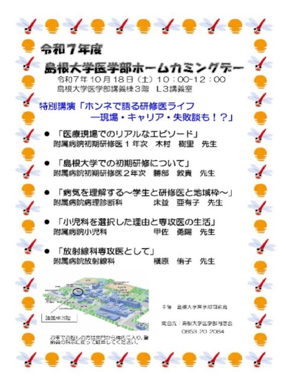 | 備考 | 当日は,島根大学医学部大学祭「くえびこ祭」が,令和7年10月18日(土)~10月19日(日)まで開催されます。併せてお楽しみください。 |