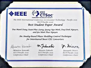 総合理工学部 機械・電気電子工学科 NGUYEN Gia Minh Thao准教授とハノイ工科大学学生の共同研究論文が、今年3月29日~31日に松江市で開催された The 2025 IEEE International Conference on Consumer Technology‐Pacific (ICCT-Pacific 2025)の最優秀学生論文賞を受賞しました。NGUYEN准教授はこの論文の責任著者でした。