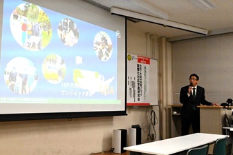 続いて、国際農業者交流協会JAEC業務部の 皆戸顕彦 部長より、欧米への渡航農業研修プログラムや協会の事業について説明いただきました。本学部からは、一戸俊儀 教授より「エチオピアにおける在来牛の乳生産試験」の研究紹介を行い、アフリカにおける家畜の特徴の話や放牧試験時のエピソード紹介がありました。また、江角智也 教授より「大学生・院生の間にしか経験できない留学や農業に関する海外での研修・研究活動」と題して、農林生産学科や島根大学国際センターにおける留学支援の取組み説明や島根大学の交流協定校の1つであるUC Davisの紹介がありました。