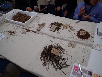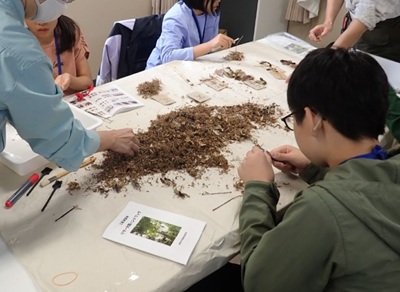 2025年10月19日に、島根県立三瓶自然館サヒメルとの共催で「サヒメル科学探険隊」の第4回目の活動「大学の研究者と一緒に活動 探ってみよう 森の落し物からわかること」が開催され、小学4年生~6年生の探検隊の皆さんが三瓶演習林を訪れました。午前中は演習林内を散策しながら、気になるリター(落葉・落枝など。小学生にも分かりやすいよう、今回は「森の落とし物」と表現しました)を拾ったり、演習林で20年以上継続されている広葉樹の長期動態調査について説明を受けました。午後は演習林スタッフが予め春から秋にかけてトラップを使って集めておいたリターの分類作業を実際に体験し、季節によってリターの種類や量が大きく変化することを学びました。その他にも、ルーペを使って小さな虫のかけらを見つけたり、珍しいナナフシの卵(大きさ約2㎜)を発見したりと、探検隊の皆さんの鋭い観察眼で、森に住む生き物たちの痕跡を見つけることもできました。