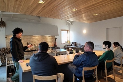 まず、久米桜酒造にて杜氏の三輪氏より醸造されたお酒の特徴を説明していただきながら試飲を行いました。「『この土地で生きる』という想いを酒にのせる」という説明が印象的で、人為的に酵母を足さず自然由来の酵母で醸造されていることも非常に特徴的でした。