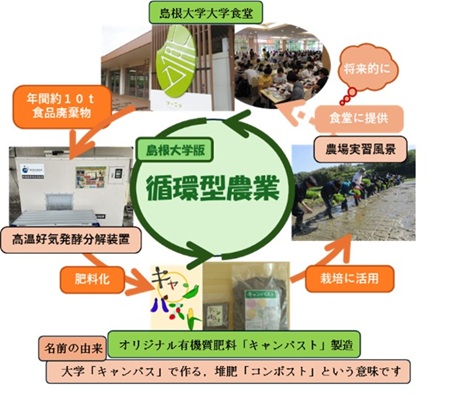 生物資源科学部では、「島根大学食品ロス・ゼロ宣言プロジェクト」として島根大学生協食堂から排出される年間約10トンの有機性廃棄物の減容化と肥料化に取り組んでおり、企業との共同研究において開発された高温好気発酵分解装置により、島根大学オリジナル有機質肥料「キャンパスト」を製造しています。今年度、附属生物資源教育研究センター・農業生産科学部門では、本庄総合農場および神西砂丘農場においてこのオリジナル有機質肥料を用いて様々な作物を栽培し、循環型農業の実現に取り組みました。これまで使用していた化学肥料の肥料成分のうち「キャンパスト」で代替できる部分を農場技術職員が正確に計算することで、化学肥料を減量化することができました。キャンパストを用いた農作物の食味品質等は、これまでの慣行栽培ものと同程度であり、「キャンパスト」の有効性を確認することができました。そして、今年度より、この「キャンパスト」を用いた農作物および加工品の販売を開始しております。