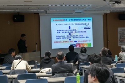 1月14日に松江テルサにて、生物資源科学部先鋭研究セミナー「未利用資源の探索・活用に関する研究」成果報告会と酒育研究会第7回集会「山陰地域で育まれる発酵の力」を開催しました。第1部では、地域と発酵産物との関わりについての4つの講演「世界と繋がり、醸す、日本初の無人駅醸造所(石見麦酒:山口厳雄 様)」、「野生の菌から見える生命力(タルマーリー: 渡邉格 様/渡邉麻里子 様)」、「島根県における新規ビール酵母の探索と醸造特性評価(島根県産業技術センター:大渡康夫 様)」、「未利用資源”ローカル発酵微生物”の探索と活用(本学部:児玉基一朗 特任教授)」が行われました。大学生、大学院生、教職員、一般市民の総勢72名参加の講演会となりました。第2部では、「山陰の発酵産業の特色」として、山陰の発酵産物関係者の紹介、先鋭研究での発酵産物の紹介、発酵産物の試食、試飲等の演習会を開催しました。演習会では、島根大学附属農場のオリジナル有機質肥料「キャンパスト」を使用して栽培したサツマイモや農場で栽培したリンゴと農場の桜から分離されたローカル酵母を用いたサツマイモビールやリンゴのシードルもお披露目されました。発酵をテーマに地域が繋がる大変意義あるセミナーとなりました。